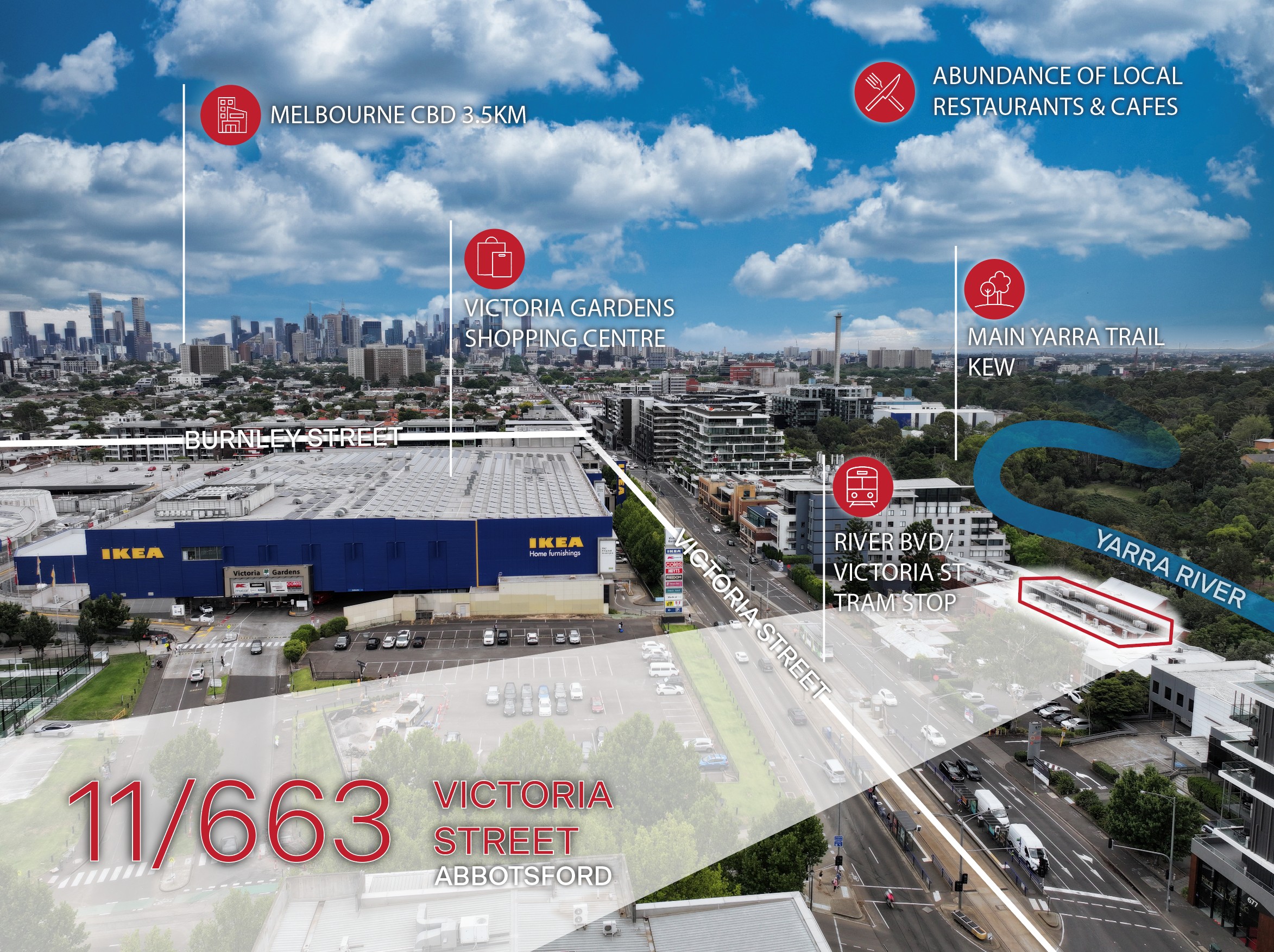 663 Victoria Street is in an enviable location on the banks of the Yarra River offering an extraordinary tranquil environment. The 109 and 12 Tram is at the doorstep providing convenient access to The CBD and North Richmond Station. Victoria Gardens is opposite giving your staff endless food options and well-known stores such as Kmart, IKEA, Hoyts Cinemas, Medical One and many more.